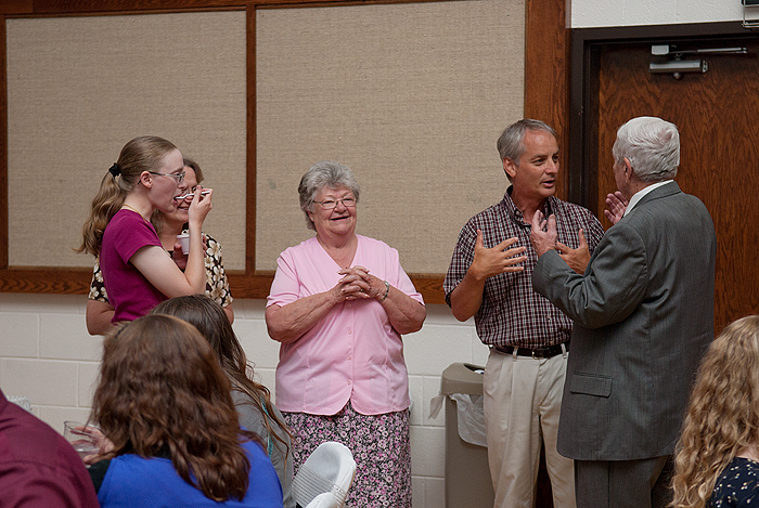 While I was off taking some pictures on my own so Evan could rest inside where it was cool, my brother came down to inform me that Evan was in the first aid room in the temple, so I ran up the stairs in my wedding dress so I could see him. The temple workers knew, and were asking if my husband was okay. That concept was still new to me, but without a second thought I said I hope so! He was very dehydrated and weak. :/ His parents were down with him as well. Evan was going to stay down while I got changed out of my wedding dress. Originally we were going to go to lunch with everyone, but we couldn't with Evan being sick. So after I got changed I went home with Evan and his parents. I'm truly grateful for our family and friends for being so supportive and helping us that day. :) Before the reception we rested for a little bit. We were going to be there a little before, but another adventure to add to the list...car problems! Our car would not start, so we borrowed a friend's truck to drive to the church. It had been fine earlier, so we didn't know what was wrong, but we had no time to check it out. When we got to the church, I was in a rush to get my dress on. Thank goodness for my sisters and my mom for all their help! :) I truly appreciated it :) After I was dressed, my cousin, Tricia took family pictures just before the reception started. There were two seats for Evan and I to sit down on, which was really nice, especially for Evan. :) The decorations and food was so great. :) I thank especially my mom for her hard work with putting the food together, and for all my family member's help as well with putting it all together. Mary Lou Spencer for the decorations, which were so awesome! Humberto Puche for making our cake. Rachelle Pugsley for making our slide show. Jerry and Naomi Hancock for the Sub Zero Ice Cream. Joy Gough and Tricia Bagley for photography. And the many family and friends who came to support us, we are so grateful. :)
